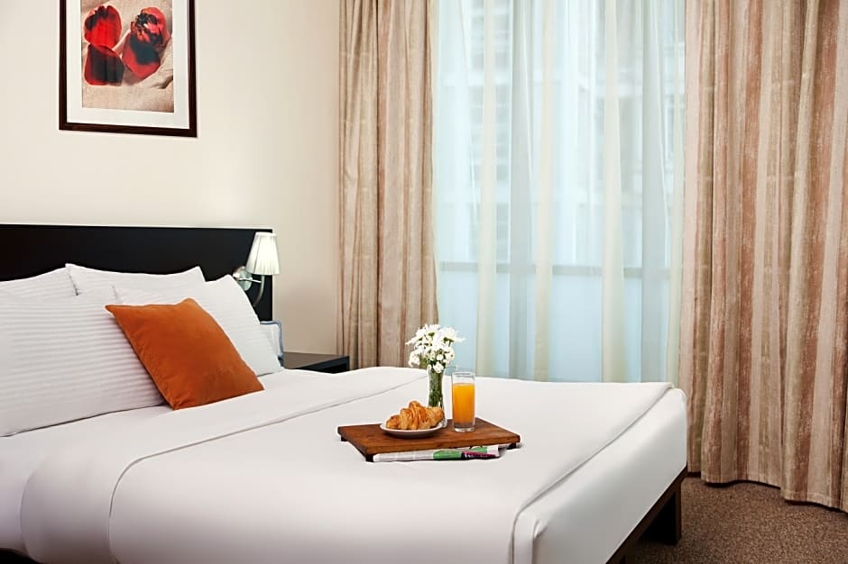 Each 31 sqm 1-Bedroom Apartment is cleverly designed to cater to a pair of traveling couples or a business group of four. It is fitted with a fully-equipped modern kitchenette, room with a double bed, private bathroom and well-partitioned living and dining areas with a double pull-out sofa bed.